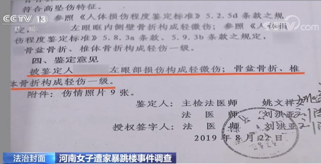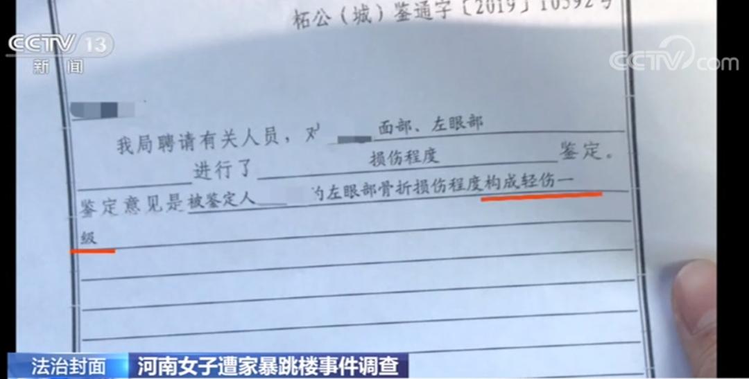 根据柘城县公安局物证鉴定室所做的第一份鉴定书显示,经调查,小燕“左眼的伤情为丈夫殴打所致,其余伤情为跳楼所致”。