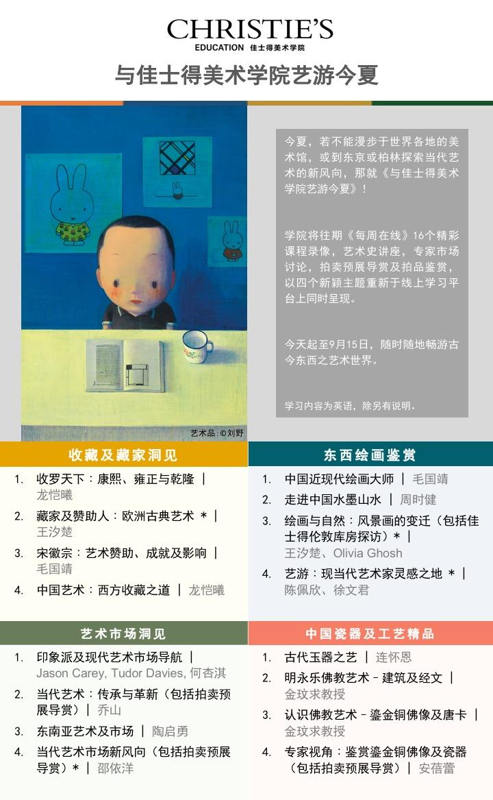 这个暑假,佳士得美术学院原计划的巴黎游学之旅被推迟,取而代之的是由佳士得各领域专家组成的“佳士得导师天团”,进行为期一个季度的“云”端视频教学。从夏天开始持续到9月15日的“与佳士得美术学院艺游今夏”课程,在网络教育平台CANVAS上线,分为“收藏及藏家洞见”“东西绘画鉴赏”“艺术市场洞见”“中国瓷器及工艺精品”四个板块,由佳士得专家主讲。