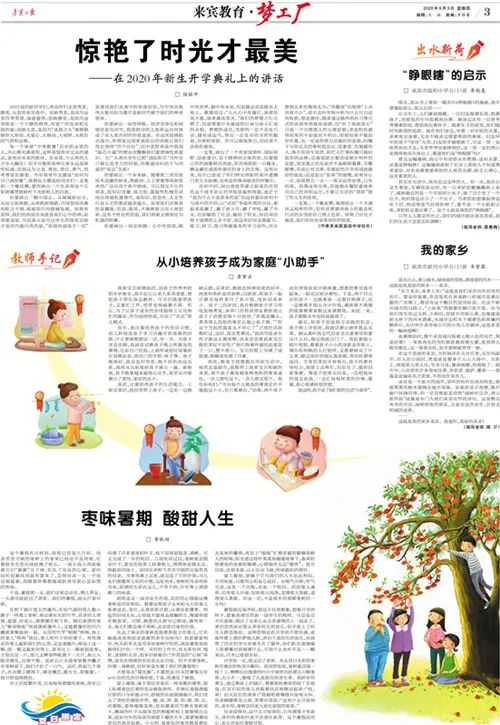 这里有我市各地优秀教师的经验之谈,有孩子们天真烂漫的笑脸;有教师的谆谆教诲,还有孩子们成长进步的点滴……《来宾日报》教育专版《来宾教育·梦工厂》聚焦我市各地各中小学校,集中报道校园里的新鲜事,分享教师和学生的优秀作品,这里是教师教书育人的特殊平台,更是孩子们梦想起航的地方!为进一步全方位讲好来宾教育故事,推动来宾教育高质量发展,小编特从《来宾教育·梦工厂》选取部分教师和学生的作品与大家分享,期待大家从中更多地了解老师的辛勤付出、无私奉献以及孩子们的童真童趣,了解教育教学工作的神圣伟大,同时也希望能给您的工作带来帮助,给生活带来欢愉。