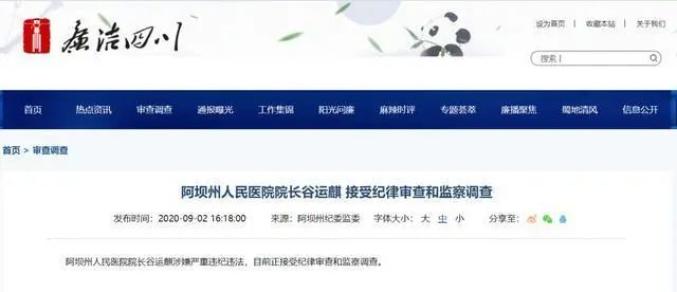 9月2日,四川省纪委监委权威发布:四川阿坝州人民医院院长谷运麒涉嫌严重违纪违法,目前正接受纪律审查和监察调查。