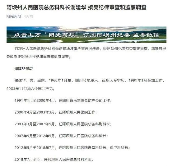 8月29日星期六,阿坝州纪委监委权威发布,阿坝州人民医院总务科科长谢建华涉嫌严重违纪违法,接受纪律审查和监察调查。