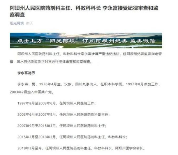第二个被查的是药剂科主任、科教科科长李永富。李永富生于1976年,1997年进入阿坝州人民医院工作,历任药剂科副主任、药剂科主任、药剂科主任、科教科科长,2018年3月至今,任阿坝州人民医院药剂科主任、科教科科长、阿坝州医学会会长。