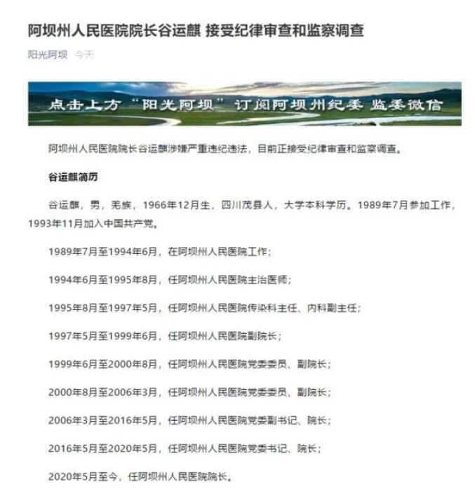 第三个被查的是院长谷运麒。阿坝州人民医院官网显示,谷运麒作为法定代表人,在医院党委领导下,全面负责医院医疗、教学、科研、行政管理工作。1989年,谷运麒进入阿坝州人民医院工作,从主治医师一步一步做到传染科主任、内科副主任,1997年起进入医院领导层,担任过医院副院长、党委委员、副书记、院长、党委书记等主要领导职务,2020年5月至今担任医院院长,是谢建华、李永富等人的老领导。