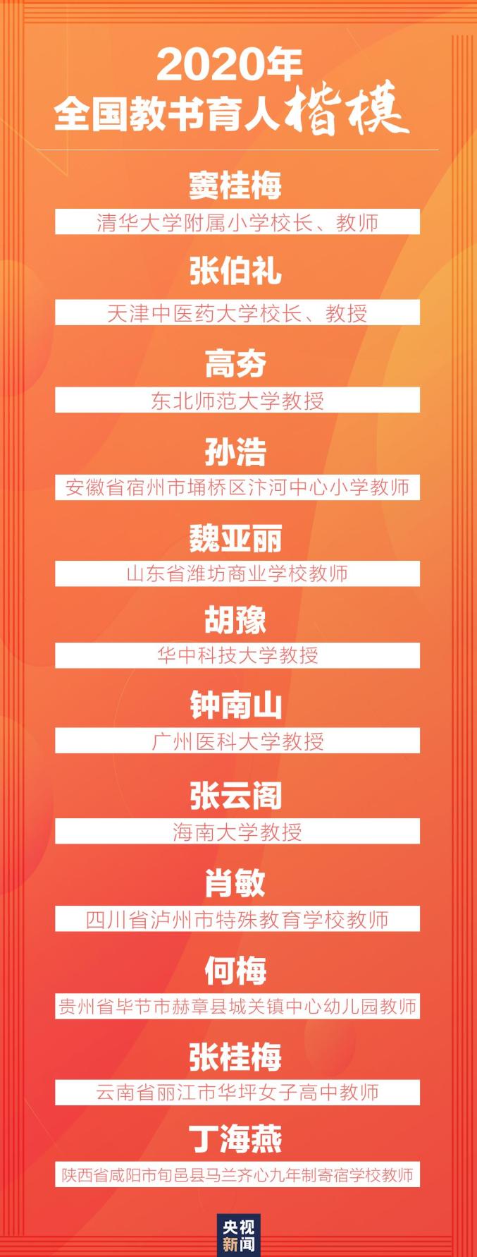 据教育部网站消息,2020年共计推出12位“全国教书育人楷模”,其中既包括抗疫中表现突出的钟南山、张伯礼,也有各级各类教育行业的教师。
