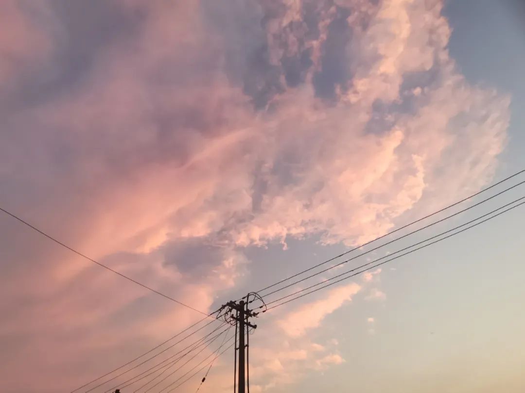 一片片白云被渲染上粉紫色