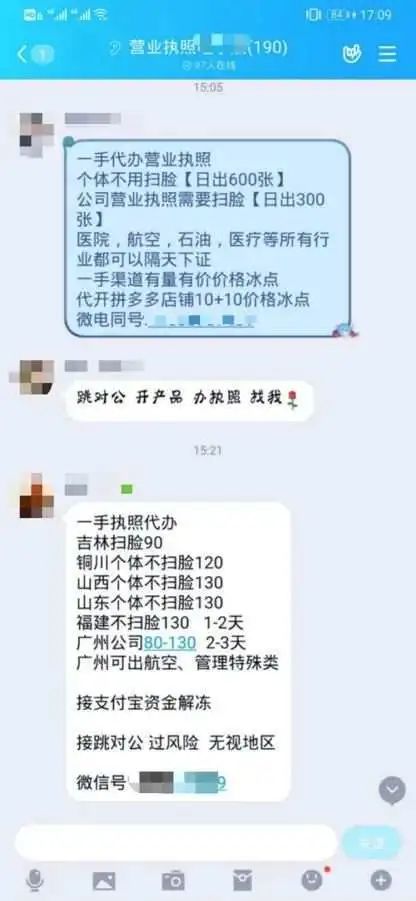 QQ群里,营业执照、公户等相关材料被称为“资料”“照片”。以开店需要的最基本材料营业执照为例,分为“扫脸”“不扫脸”两种。记者调查发现,“扫脸”的营业执照更难撤销,对买家来说更为稳定,价格略高。营业执照价格,从几十元至几百元不等。