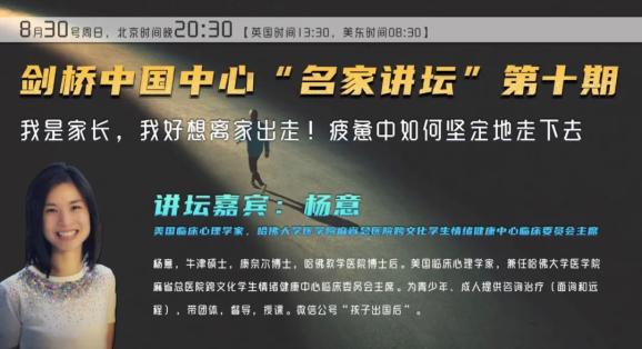 今天是剑桥中国中心“名家讲坛”第十讲。这次讲坛的时间比较特别。受疫情的影响,很多孩子在家里已经呆了好几个月的时间。现在是8月底,我们即将迎来期盼已久的“开学季”。今天我们荣幸地邀请到美国临床心理学家,哈佛教学医院博士后杨意老师,和大家聊一聊家庭关系、亲子关系。