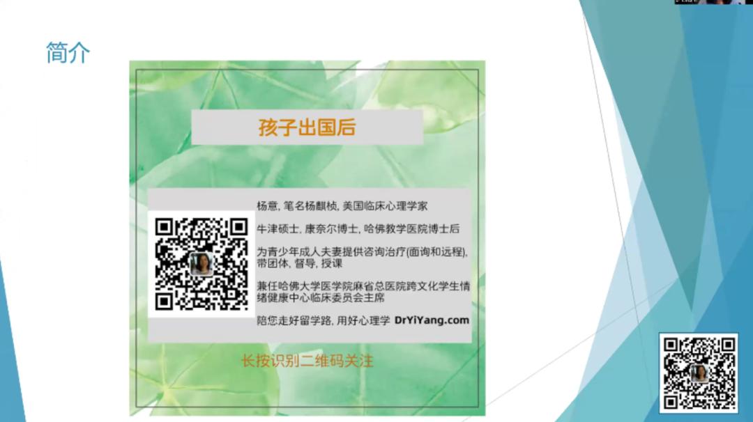 杨意老师是超级大学霸,牛津硕士,康奈尔博士,哈佛教学医院博士后,美国临床心理学家,兼任哈佛大学医学院麻省总医院跨文化学生情绪健康中心临床委员会主席。欢迎大家关注杨意老师的原创微信公众号“孩子出国后”、头条号“杨意谈心”。