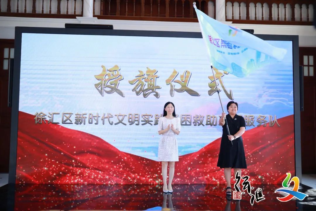 为充分发挥党员干部示范带头作用,团结更多企事业单位和爱心人士,帮助社会困难群体,助力精准帮困,由徐汇区民政局发起,联合区级机关工作党委、人社局、合作交流办、残联和红十字会共同成立了“徐汇区新时代文明实践帮困救助服务队”,并分别推出“纾难解困、桑榆暖心、汇平爱心、点亮梦想、携手扶贫、乐业聚力、汇爱前行、初心同行、携手谐行、博爱同行”等十个帮困救助服务项目。现场进行了隆重的授旗仪式,徐汇区委常委、宣传部部长吕晓慧向区民政局负责人授总队旗,相关部门领导向区级机关工作党委、民政局、人社局、合作交流办、残联和红十字会授分队旗。