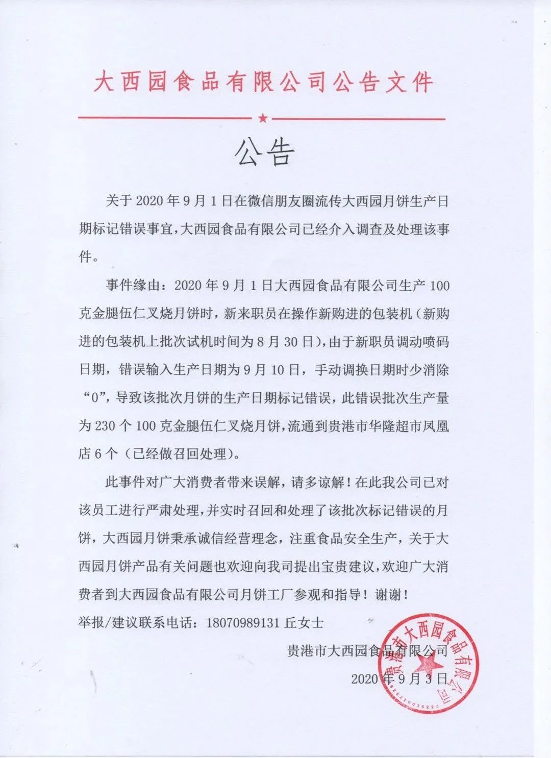 9月4日,港北区市场监管局已督促贵港市大西园食品有限公司生产该批次230个月饼进行处理,召回已流通到贵港市华隆超市凤凰店的6个月饼,封存未出库的224个月饼。