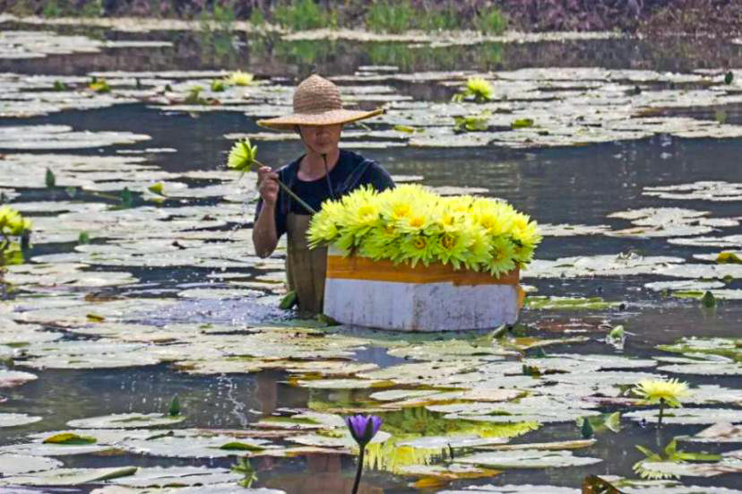 ▲停云小镇以九品香水莲花衍生出干莲花茶、莲花饼、莲花特色菜等产品,深受消费者欢迎。