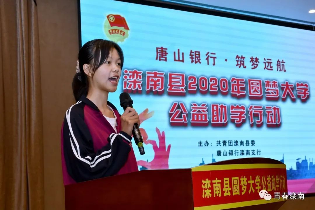 她代表所有受资助的同学,对给予她们爱和温暖的县委、县政府表示深深地感谢。对一直关心青年学生成长的团县委以及奉献无私大爱的唐山银行表示深深地敬意。
