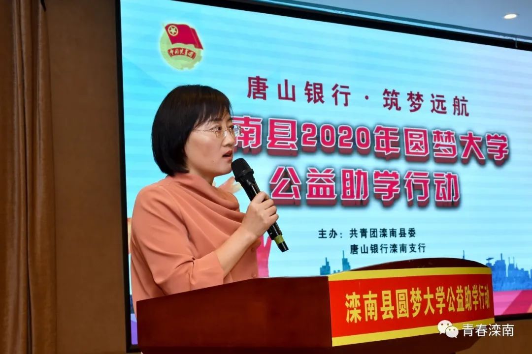 团县委副书记邸烁冉介绍圆梦大学公益助学行动开展情况,宣读“唐山银行 筑梦远航”—滦南县2020年圆梦大学公益助学行动受资助学生名单。