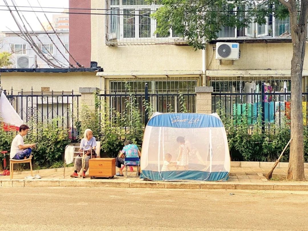 马路上,不知是谁家拿了顶蚊帐放在小区门口,一个扎着两条辫子的小女孩带着还没长出头发的弟弟在里面安安静静地玩耍。蚊帐外面,奶奶坐在板凳上拿着蒲扇给他们扇凉。再旁边,一位头发花白的老奶奶坐着椅子上望着他们,她的前面放着给腿脚不便的人定制的辅助器。
