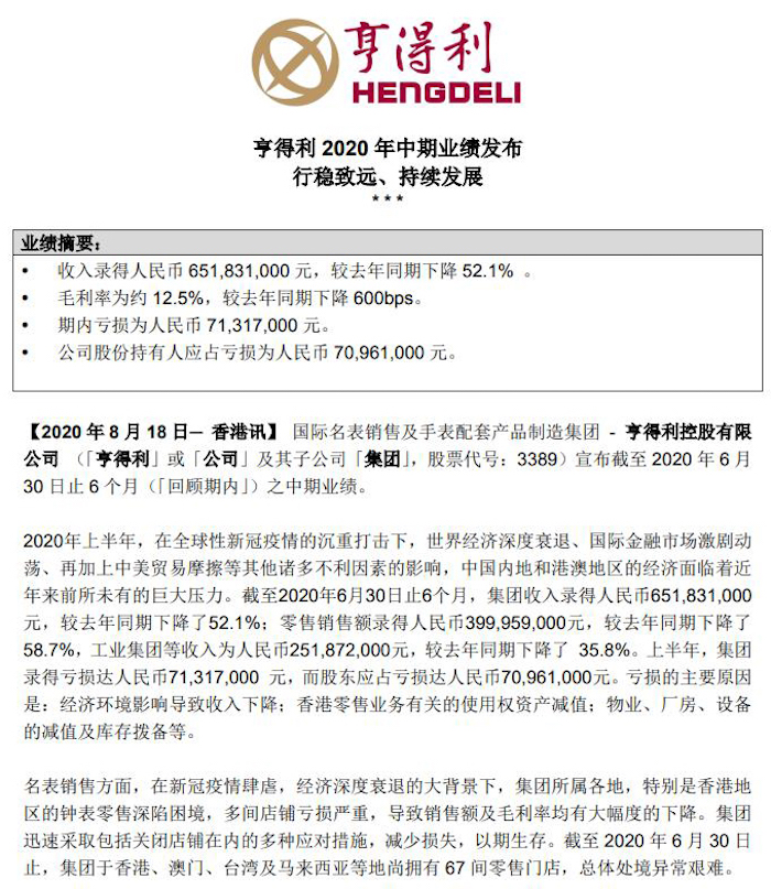 亨得利于8月19日发布的《2020 年中期业绩》显示集团上半年亏损严重。