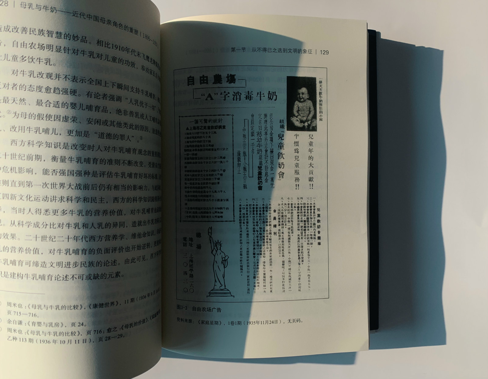 其实,本书所采用的实证资料已很丰富,包括上海档案馆的档案、统计数据、社会调查、教科书、报纸、广告、图像、期刊、杂志、日记、回忆录、文学作品等官方和民间资料,从牛乳消费到妇女生活、母亲到婴孩等的文字及非文字材料。当中不少属近年的热门研究领域“日常生活史”资料门类,也包括十九世纪和二十世纪之交大量传入中国的西洋及日本的知识媒体等。的确,在当时中国正遭逢千古未有的大变时,亡国亡种的危机感助长了强国强种的意识,妇女治家育儿等家内事也成为公共领域上备受关注的兴国强种大业。本书指出,当舆论强调母乳哺儿的强国强种作用时,正值牛乳东来之际,奶粉商遂以科学和文明话语推销牛乳,强调这种重视营养和卫生的科学化育儿法有强国强种实效,终令奶粉打进中国市场,牛乳哺育得在中土萌芽滋长。