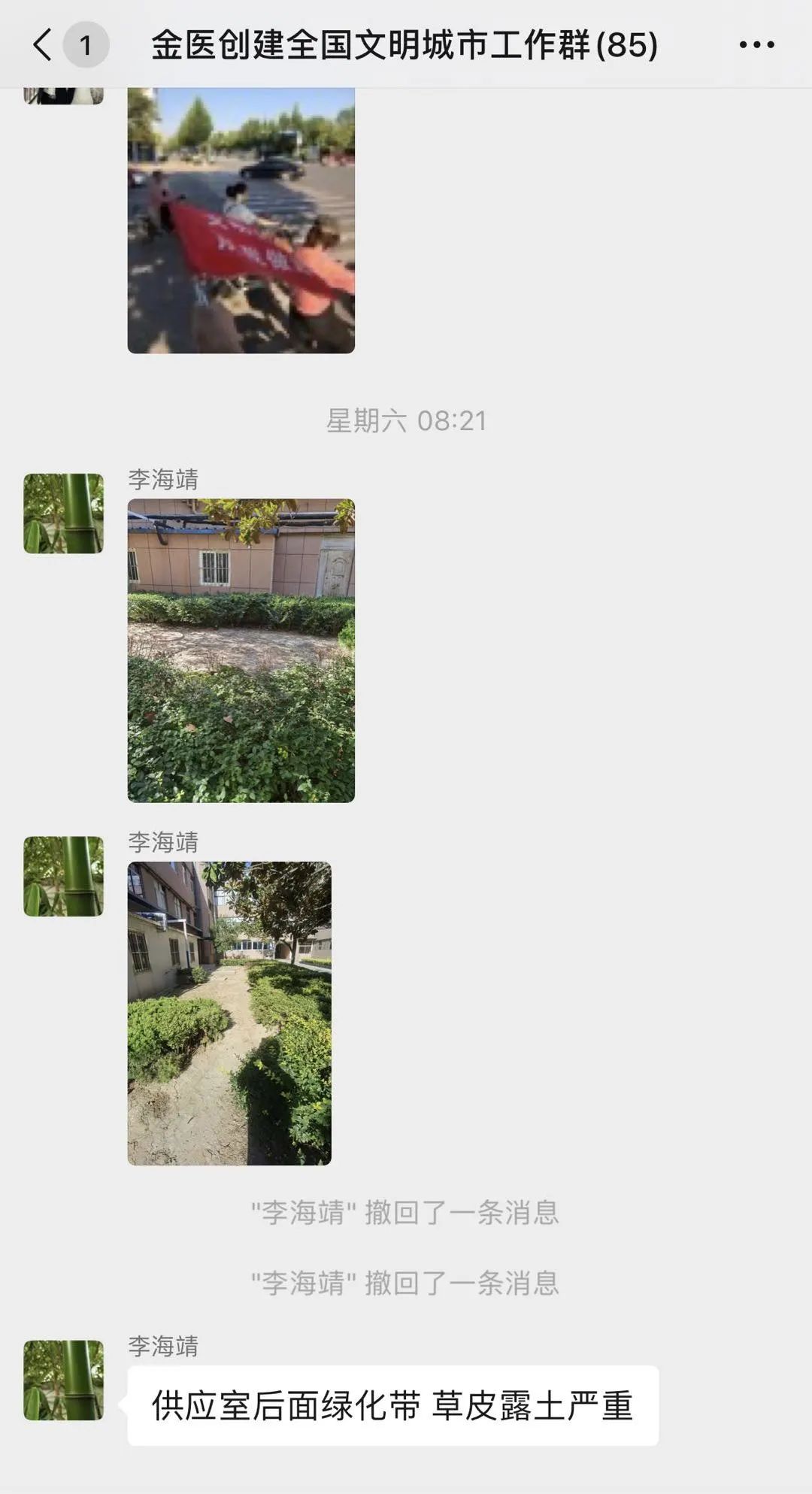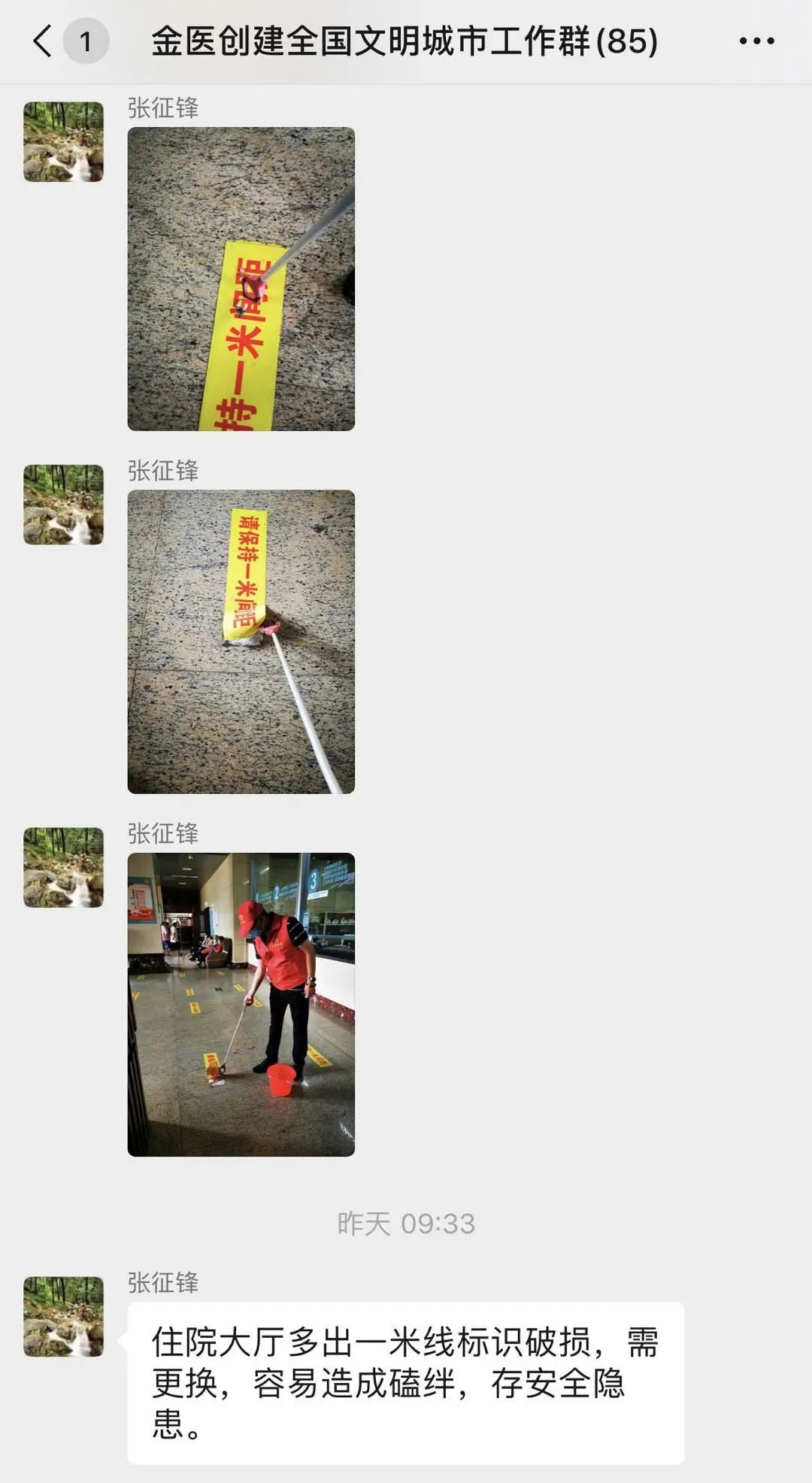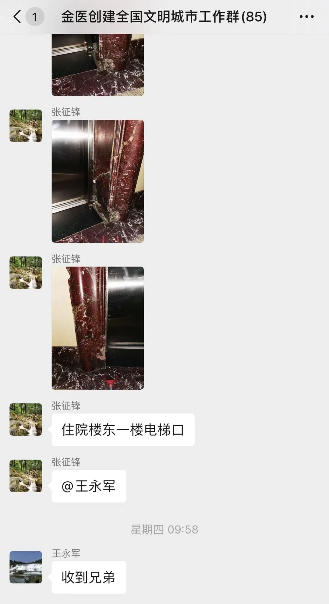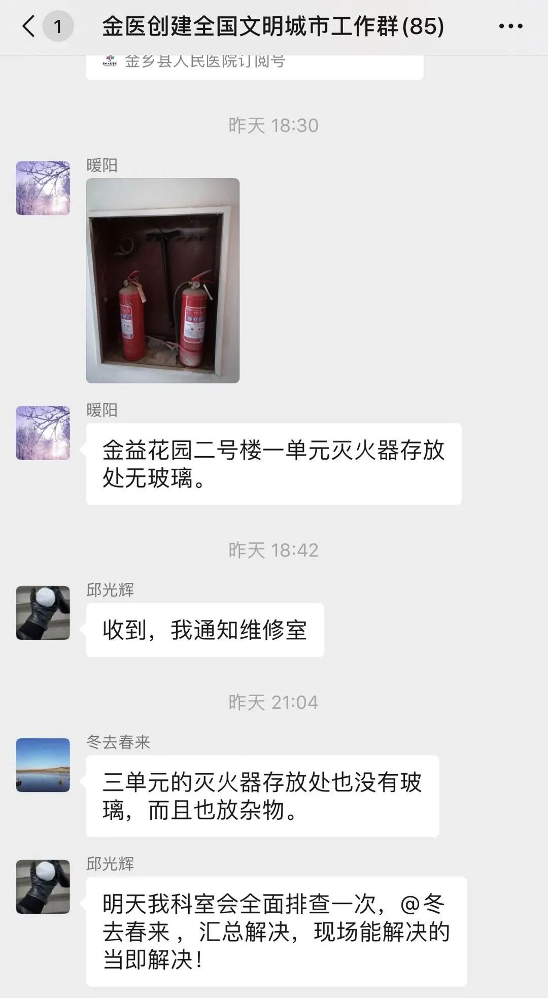 “住院大厅一米线标识破损,需更换,容易造成磕绊,存安全隐患。”,“金益花园二号楼一单元灭火器存放处无玻璃……”在金乡县人民医院创城工作微信群中,每天都会收到这样的信息,医院通过动员全院干部职工及物业保洁人员对院区各个场所、角落进行找“茬”开展整改提升工作,大家只要发现不足之处就拿起手机拍下来,向相关责任人反馈并解决处理,自觉维护医院的环境卫生,给就诊群众营造良好的就医环境。