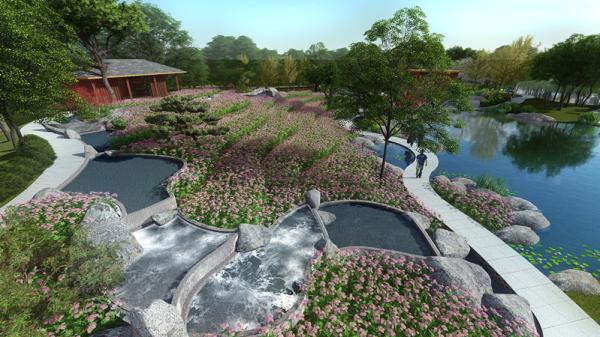 深入园中,内部主景以《插秧歌》作为“情、澜”的景观承载。沿路前行,听雨轩内,镂空设计配以水幕帘,打造出“听雨”效果。东坡堂外,远处溪流叠水、花海梯田尽收眼底,生动再现东坡先生巡访秧田、路遇农民高唱“插秧歌”的场景。曲桥理水,形成大小高低不一的两个水面,邻水的寒晖榭内放置竖笛,旋转按钮,可闻乐曲悠扬,与景相合,趣意盎然。