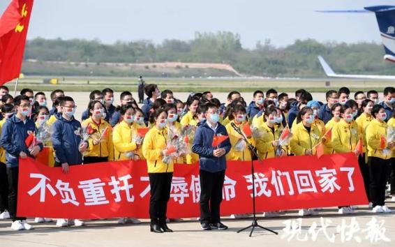 △邱泽森(前右)带队返回南京时,在机场合影留念 资料图片江苏省卫生健康委员会副主任邱泽森,作为江苏省支援湖北医疗卫生队总领队,代表江苏医疗队领取了 " 全国抗击新冠肺炎疫情先进集体 " 的奖牌。" 我还记得 3 月 10 日习近平总书记在湖北看望一线医务工作者时说的话,' 你们是最大的功臣,党和人民要给你们记头功。'" 邱泽森说," 先进集体 " 的荣誉,是对江苏 2820 名援湖北医疗队队员在前方辛勤付出的肯定,是国家对 " 苏大强 " 的认可。