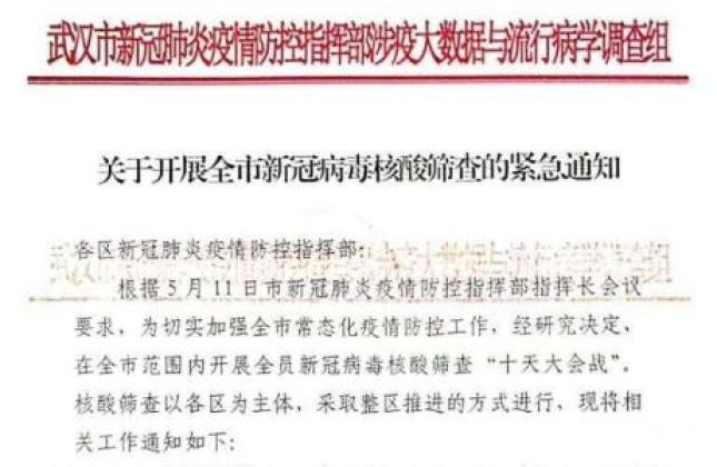 正是因为这些人的坚守,我们中国人才更加安心;也因为国家的努力,我们中国人更有底气。5 月 11 日晚,武汉市新冠肺炎疫情防控指挥部涉疫大数据与流行病学调查组印发《关于开展全市新冠病毒核酸筛查的紧急通知》,计划将于 10 天内在武汉全市范围开展全员新冠病毒核酸筛查。