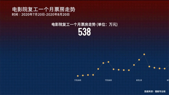 电影市场回暖,影院票房持续走高。近一个月来,全国电影累计票房突破11亿元。影院复工已有月余,猫眼数据显示,7月20日至8月20日,全国电影累计票房达11.04亿元,放映场次474.47万场,观影人次3571.08万。据灯塔专业版,七夕节的当天票房达到5.23亿元,创下影院重启以来的新高!