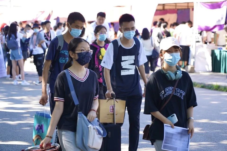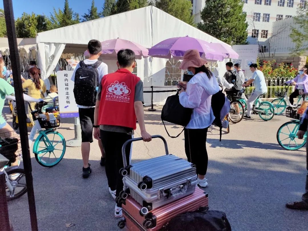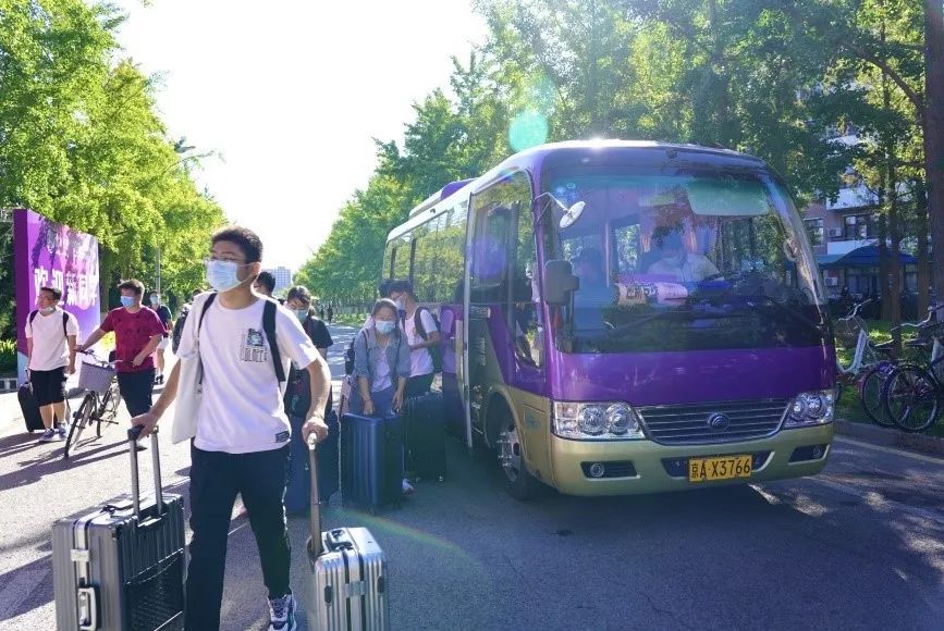 清华,我们来啦!晨光熹微,迎新志愿者们在北京站、北京西站、北京南站、首都机场、大兴机场早已等候多时,热情迎接一张张满怀无限憧憬的新面孔。在疫情防控常态化要求下,送新生的车辆和亲友不能入校,满载新生的班车抵达紫荆学生公寓区。