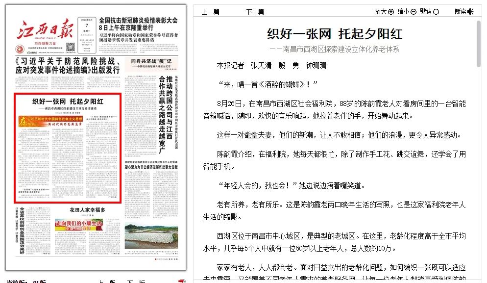 原标题:《【媒体中的西湖】江西日报头版刊登《织好一张网 托起夕阳红——西湖区探索建设立体化养老体系》》