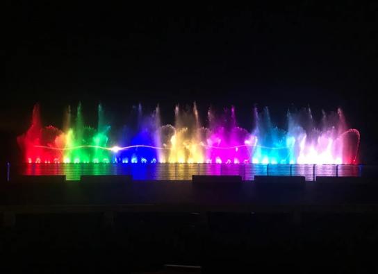 夜晚,在水幕喷泉投影机的控制下,五颜六色的水幕喷柱交替变换,60m*18m的水幕电影,给观赏者来一次从未有过的户外观影体验,感受声、光、电、水、融为一体,艺术与智慧有机融合的科技魅力。
