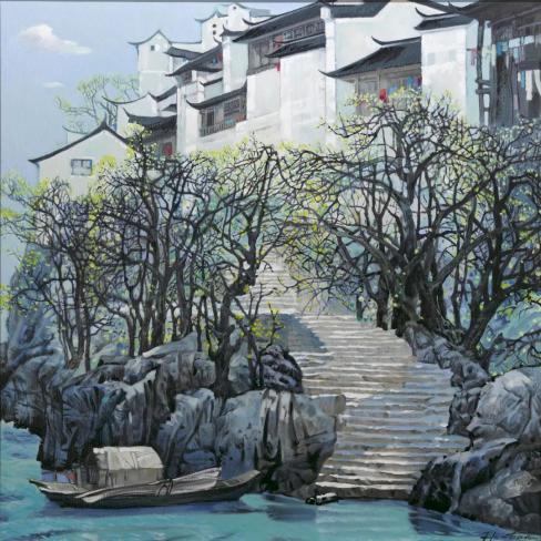■ 以装饰风格,用写实和写意、具象和抽象相结合的手法,描写历史题材,表现重大主题,何山的探索,是非常成功的。在浏览他这些作品时,我发现何山似乎是有意地用中国画的方法去描绘西方的风景,特别是那些古老的城市建筑,而却用油画去表现中国人观念中的山水花鸟,并且都是那么的精致,给人一种勃郁丰茂的感觉。长期以来,何山同时也在探索中西绘画的合璧、互换的逆向方法,也许是他新的实验。不固定于已经取得的成功的格式,始终保持着艺术创作新鲜新颖的感觉,在探索中追求尽善尽美,这就是何山的个性和风格。