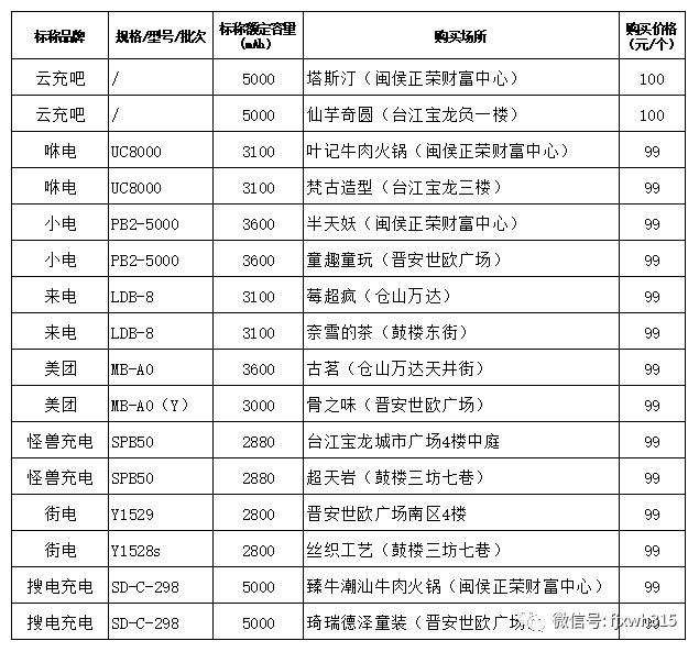 本次比较试验样品由省、市消委会工作人员以普通消费者身份,在全市16家提供共享充电宝租赁服务的综合商贸体、旅游景点、餐饮娱乐、生活服务等场所租赁并购买共享充电宝16款,标称额定容量从2800mAh到5000mAh不等,基本涵盖全市运营共享充电宝品牌,为街电、小电、来电、怪兽充电、云充吧、咻电、美团、搜电充电8个品牌。