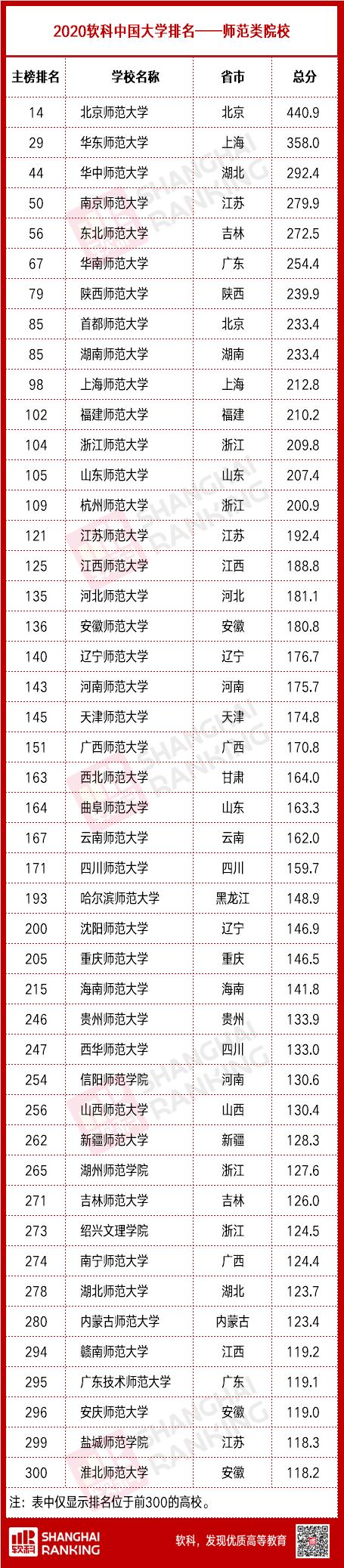 我国目前有100多所师范院校,是一个数量庞大的学校类型,分布在全国各个省市。在2020软科中国大学排名中,有46所师范院校进入主榜前300:其中北京师范大学作为“领头羊”位居第一!华东师范大学和华中师范大学也具有非常强的竞争力,分居第二和第三。南京师范大学、东北师范大学、华南师范大学、陕西师范大学、首都师范大学、湖南师范大学和上海师范大学进入前十。