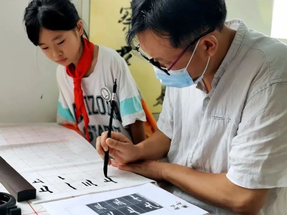 西泠印社的专家从最基本的姿势、握笔、笔法等方面耐心指导。“专家很亲切,指导很细腻,包括我的手型、坐姿等,非常感谢专家们的指导。”受到指导的同学幸福地说。