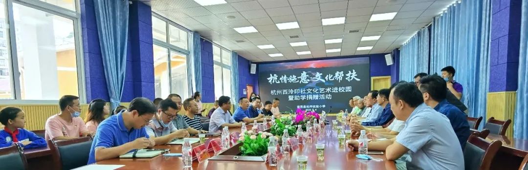 叁吴槐庆等领导与西泠印社艺术名家参加了座谈交流会,在宣恩县常委、宣传部长姚元文的主持下,校长冯安禄介绍学校情况,西泠印社专家、大师根据学校目前的情况建言献计,并提出将采用多种形式共同教授,切实实现东西协作共育人。