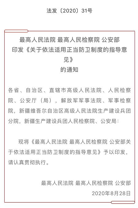 日前,最高人民法院、最高人民检察院、公安部联合发布了《关于依法适用正当防卫制度的指导意见》。
