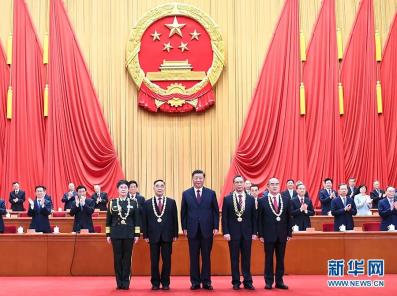 9月8日,全国抗击新冠肺炎疫情表彰大会在北京人民大会堂隆重举行。中共中央总书记、国家主席、中央军委主席习近平向“共和国勋章”获得者钟南山(前排右二),“人民英雄”国家荣誉称号获得者张伯礼(前排左二)、张定宇(前排右一)、陈薇(前排左一)颁授勋章奖章。新华社记者 谢环驰/摄3