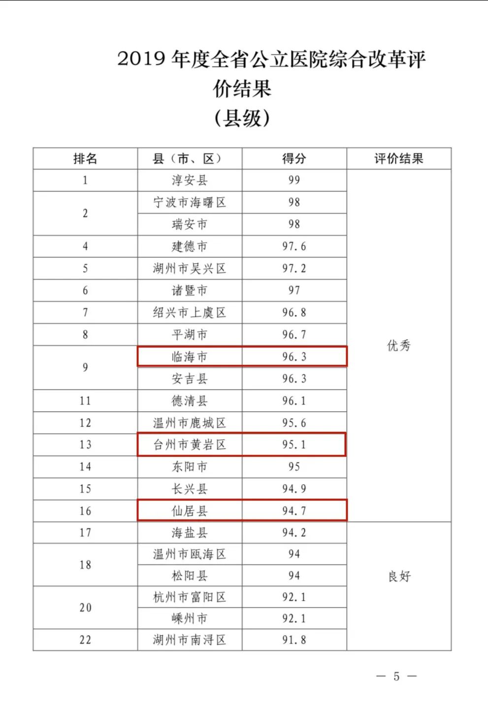 日前,2019年度全省公立医院综合改革评价工作结果出炉。我市以全省第二的排名获优秀等次,并获得中央和浙江省财政补助资金4537万元。县级方面,除椒江没有参评的公立医院外,临海、黄岩、仙居在全省排名中获优秀等次,天台、三门、温岭、玉环、路桥等5个县(市、区)获良好等次。