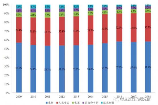 从这一份超市中各商品的占比可知,从2016年到2018年,生鲜的占比相较于2015年还有所提升。2015年,超市中生鲜商品占总商品的56.2%,到了2018年,反倒增长到了57.9%。