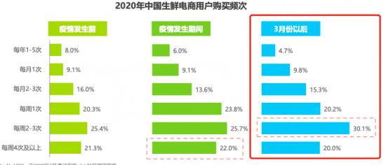 而且就算在疫情期间,生鲜市场的在线购买短暂地增加了,那也是因为不让出门,人们买菜不方便。到了3月份,数据就回落到跟疫情前差不多。仅仅只有原本每周2-3次的用户部分有增加。而随着夏天的到来,生鲜食品不耐保存,这部分数据势必还将会下降。