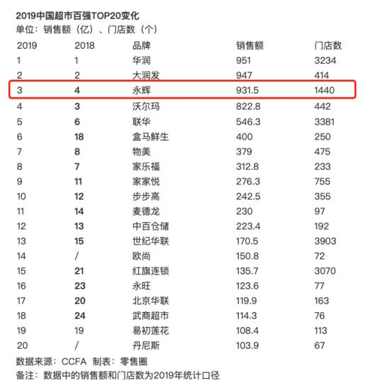 2019年,永辉成功地挤下了沃尔玛,位列中国超市百强的前三甲。这靠的,绝不是占比仅占10%左右的生鲜电商业务,而是其稳扎稳打的超市业务。
