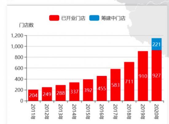 永辉超市近几年一直处于快速扩张阶段。其开店规模从2011年的204家,飞速增长到2019年的910家。截止到2020年年中,已开店数量为938家,另有254家已签约未开业。
