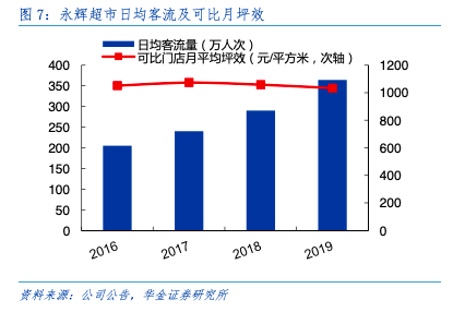 从坪效也可以看出高速增长并未影响其单店的盈利能力,从下图可以看出,从2016年到2019年,永辉的日均客流量一直在稳定增加,而起可比门店月平均坪效也十分稳定,一直维持在1000元左右。