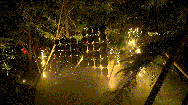 结合实际场地情况,在树木中构筑投影介质