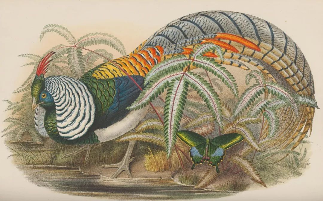 这两只白腹锦鸡实际上可以算作战利品。在第一次英缅战争(1824~1826)中,战败的缅甸一方将两只白腹锦鸡作为礼品送给了英国,最终到了莎拉的手中。
