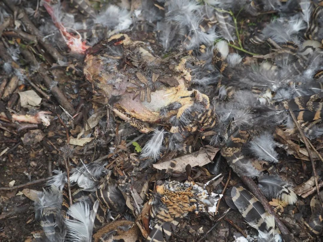 作为一种体型还算比较大的雉类,白腹锦鸡抵御天敌和保护后代的能力并不是特别强,一些鸦科鸟类甚至都可以捕食它们的鸟蛋和雏鸟。成年后,它们仍然是一些猛禽或者哺乳动物的捕猎对象,比如苍鹰和鼬科动物。我在进行鸟类调查时,就曾误打误撞地打扰到苍鹰进食白腹锦鸡。当时,一只苍鹰从灌丛中被我们惊飞,我们几个人下意识地钻进灌丛去苍鹰飞起的地方看了看,结果就发现了一只被吃掉一半的白腹锦鸡。虽然发现的是一只尸体,但尸体对于我们来说仍有价值,顺手采集了一些样品给研究白腹锦鸡的同行带了回去。