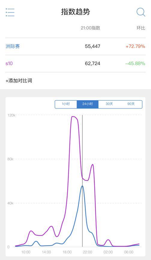 数据显示,9月9日晚19:00,“洲际赛”相关内容的微博指数仅为14211,而同期以“S10”作为搜索词,显示数据则为118638,差距极为明显。二者数据差最小的时刻发生在TSG战队夺冠后的短短一小时内,但即便如此,洲际赛的搜索指数仍无法超越S10。