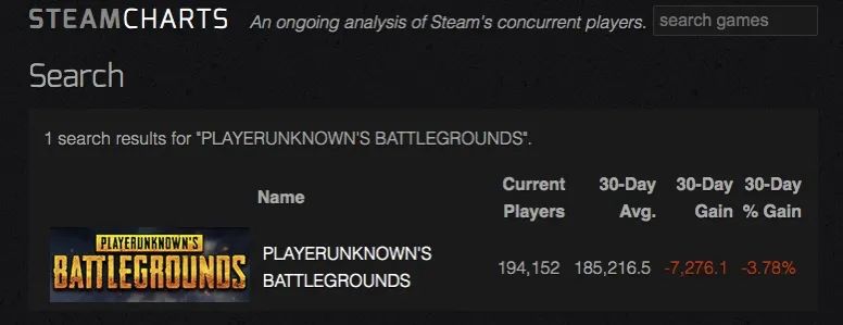 根据SteamCharts网站的数据显示,近30天来PUBG的玩家高峰数已经持续跌落到了194152人。而网站首页的Top Records还记录着它曾经的辉煌:在2018年1月,PUBG的玩家峰值高达3236027人,至今仍排在纪录榜的首位。