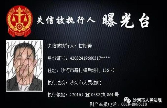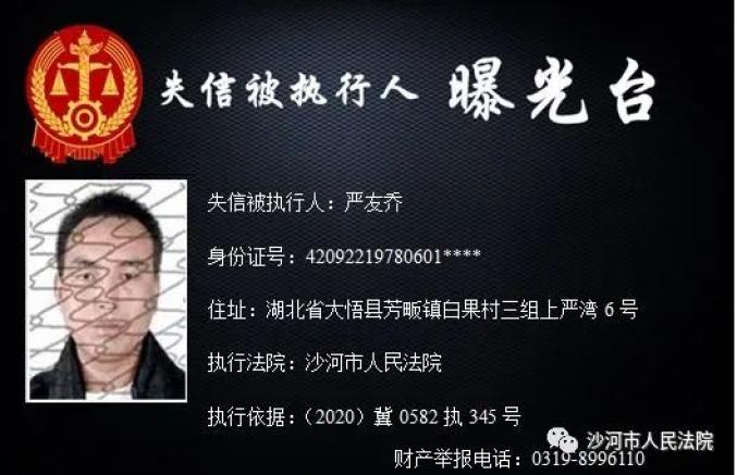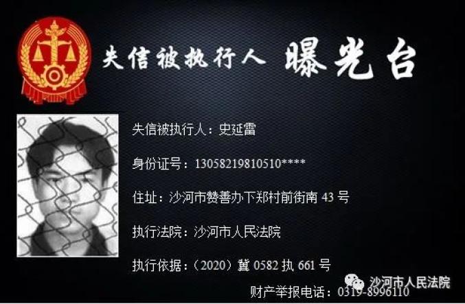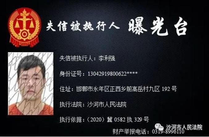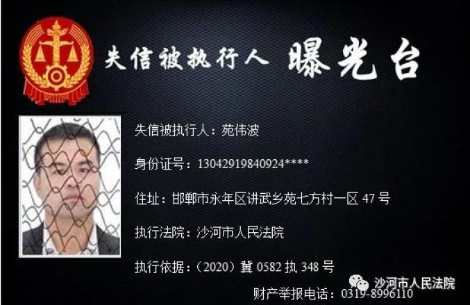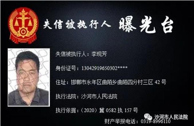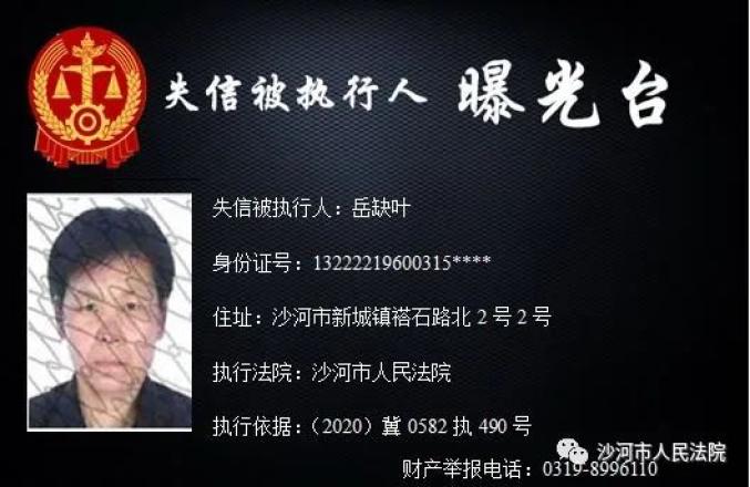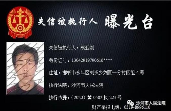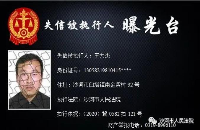 为加大失信惩戒力度,推动“法治沙河、诚信沙河”建设,根据《中华人民共和国民事诉讼法》、《最高人民法院关于公布失信被执行人名单信息的若干规定》、《最高人民法院关于限制被执行人高消费的若干规定》,沙河市人民法院决定公开失信被执行人信息,敦促失信被执行人履行判决义务。法院将对未能履行判决义务的失信被执行人采取搜查、拘留、罚款、追究拒执罪等多种强制措施,对赖账行为一追到底。财产举报电话:0319-8996110。