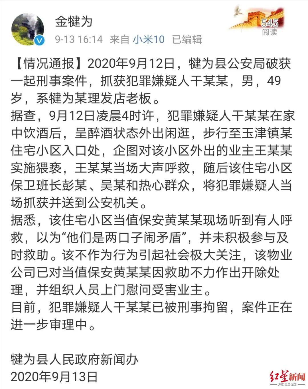 据犍为县政府新闻办发布的情况通报显示,9月12日凌晨4时许,犯罪嫌疑人干某某在家中饮酒后,呈醉酒状态外出闲逛,步行至玉津镇某住宅小区入口处,企图对外出的业主王某某实施猥亵,王某某当场大声呼救,随后该住宅小区保卫班长彭某、吴某和热心群众将犯罪嫌疑人当场抓获并送到公安机关。