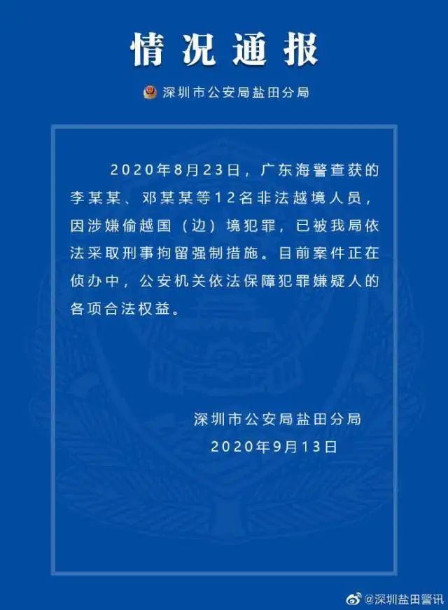 搜全国【 12名乱港分子偷渡!在深圳被刑拘!】深圳市公安局盐田分局通报:2020年8月23日,广东海警查获李某某、邓某某等12名非法越境人员,因涉嫌偷越国(边)境犯罪,已被我局依法采取刑事拘留强制措施。目前案件正在侦办中。