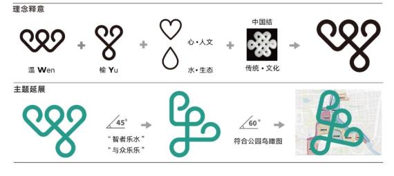 将温榆河首字母W、Y流畅连接,构成标志主形,表现出温榆河公园以水为脉、源远流长的环境特色;将标志旋转45度,字母组合的WY会神奇地幻化成汉字的“乐”,巧妙地折射出本标志“智者乐水,与众乐乐”的核心理念;将标志旋转60度,又暗合了温榆河公园的鸟瞰全景图,构成了三位一体的奇幻组合;